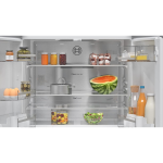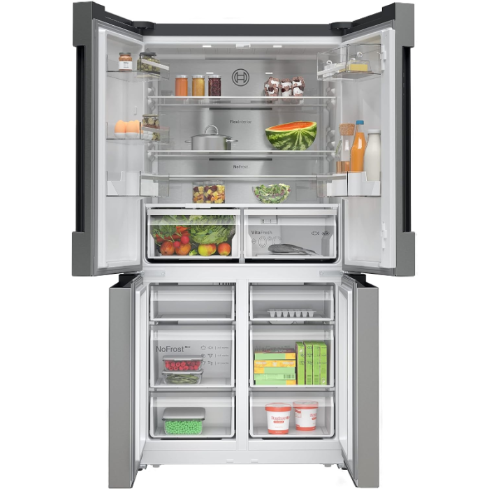 El Bosch Serie KFN96 es un frigorífico multipuerta de libre instalación con tecnología NoFrost, fabricado en acero inoxidable con acabado antihuellas. Mide 183 cm de alto por 191 cm de ancho, lo que lo convierte en un electrodoméstico de gran capacidad, ideal para familias numerosas o personas que requieren amplio espacio de almacenamiento para alimentos frescos y congelados.