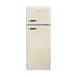 Este frigorífico tiene dos puertas, una para la nevera y otra para el congelador. Tiene espacio suficiente para guardar comida de una familia pequeña. Es fácil de usar, enfría bien y no hace mucho ruido. Su diseño retro en color beige lo hace especial y diferente a los frigoríficos normales. Además, ocupa poco espacio y queda bien en cocinas con estilo.