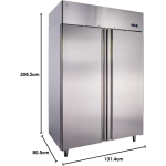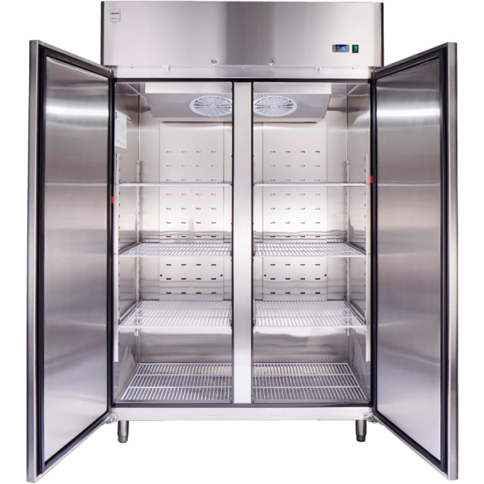 Este frigorífico grande de acero inoxidable es perfecto para cocinas profesionales. Tiene mucho espacio (940 litros), mantiene los alimentos fríos de forma uniforme, y es fácil de limpiar. Las puertas se cierran solas, se puede mover con ruedas, y se ajusta la temperatura con un panel digital. Es ideal para quienes necesitan guardar muchos alimentos de forma segura y eficiente.