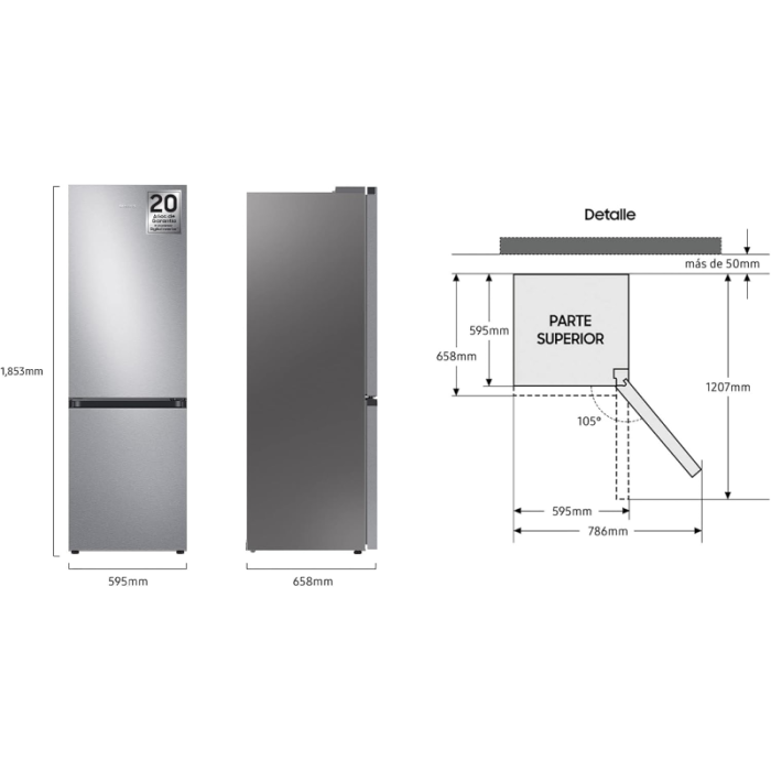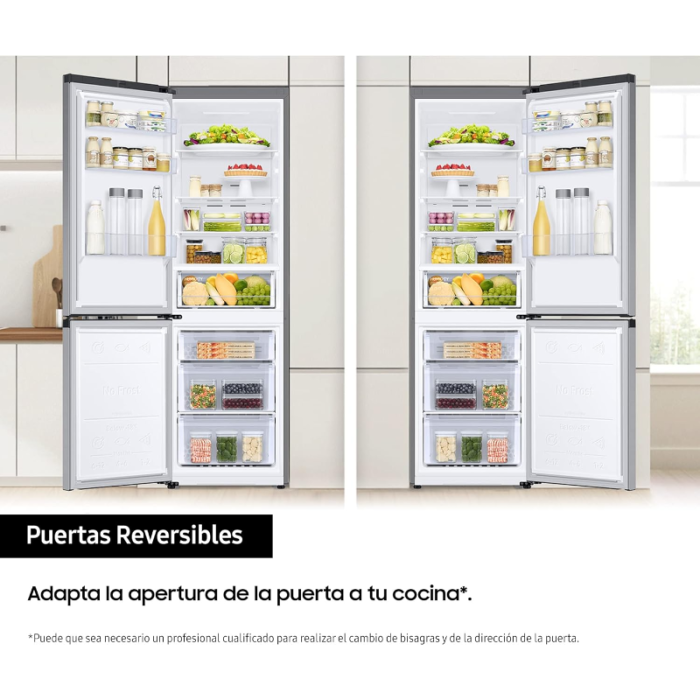 Este frigorífico Samsung tiene mucho espacio por dentro sin ser más grande por fuera. No hace escarcha, enfría bien por todas partes y casi no hace ruido. Gasta poca luz y te ayuda a mantener la comida fresca más tiempo. Además, es fácil de usar, tiene un diseño moderno y no necesita descongelarse nunca. Ideal para quienes quieren un frigorífico práctico, eficiente y duradero.