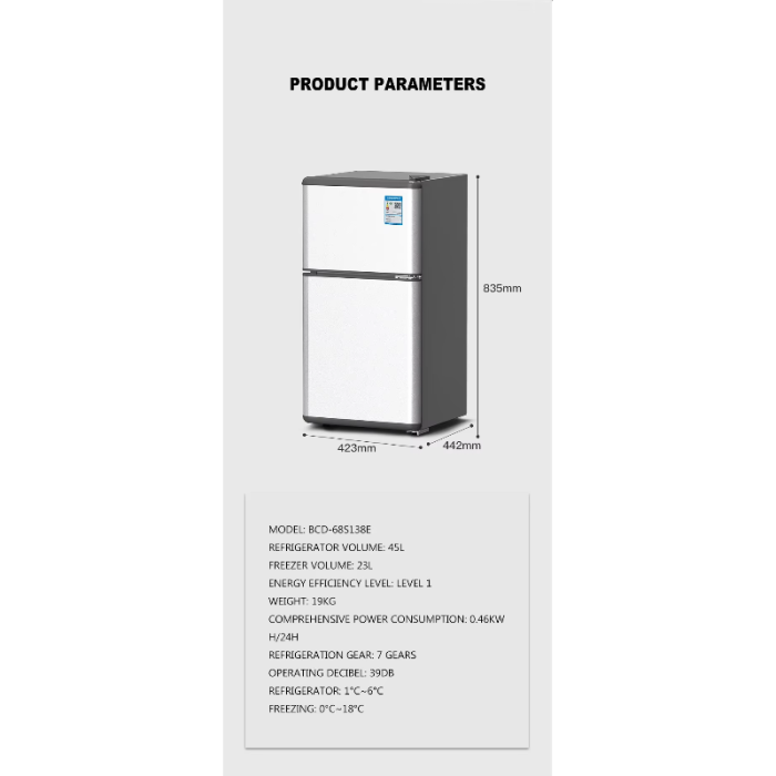 El Snowsea BCD-68S138E es un minirefrigerador de doble puerta con una capacidad total de 68 litros, diseñado para ofrecer refrigeración rápida y eficiente en espacios reducidos. Es ideal para estudiantes, personas que viven solas, oficinas, habitaciones de hotel, apartamentos pequeños o como refrigerador auxiliar en el hogar.